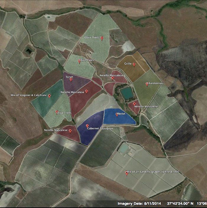 The Contessa Entellina DOC hosts their 'Miccina', 'Gerbino’, and 'Paradiso' vineyards, planted on slopes 350-480 meters above sea level with quintessentially Sicilian soils of volcanic tuff intermingled with limestone rich clays. Their even higher elevation ‘San Giacomo' and 'Fiuminello' vineyards (680-830m) climb the Eastern slope of Monte Genuardo and surround the family’s cellars in the DOC of Sambuca di Sicilia. If you want to know more about the characteristics of this area you can take a look at www.vinerra.com